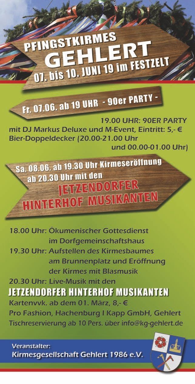 Endlich ist es wieder soweit, dass wir unsere traditionelle Pfingstkirmes feiern können. Vom 03.06.2022 bis 06.06.2022 steht auf dem Freizeitgelände in Gehlert das Festzelt bereit, um dort mit euch und unseren Kirmesfreunden kräftig zu feiern.